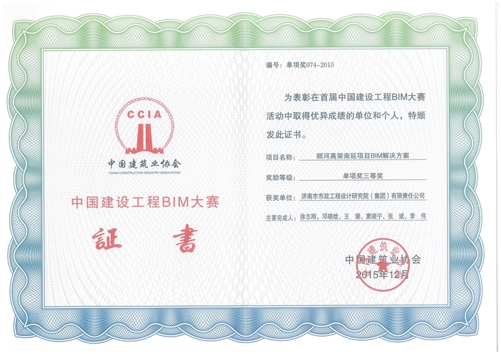 12月29日,首屆中國建設(shè)工程BIM大賽頒獎(jiǎng)暨表彰大會(huì)在??谂e行,集團(tuán)兩項(xiàng)成果獲獎(jiǎng),其中“BIM技術(shù)在濟(jì)南市唐冶新區(qū)市政工程中的應(yīng)用”獲得二等獎(jiǎng),“順河高架南延項(xiàng)目BIM解決方案”獲得三等獎(jiǎng);另外,“BIM技術(shù)在分離式立交工程中的應(yīng)用——青島長江路與昆侖山路立交”得到書面表彰。